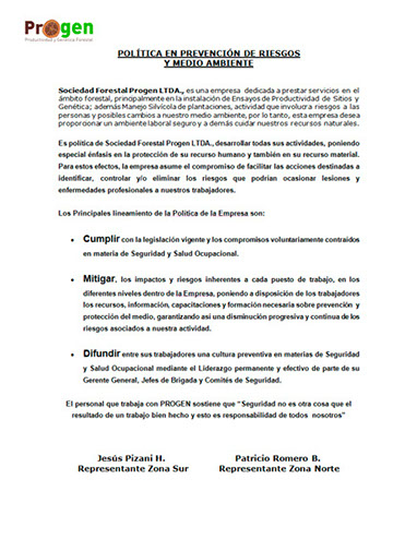 El personal que trabaja con Progen sostiene que "Seguridad no es otra cosa que el resultado de un trabajo bien hecho y esto es responsabilidad de todos nosotros.
